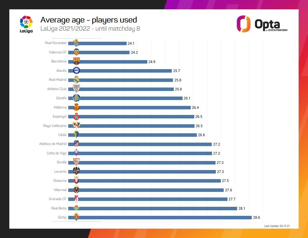 西甲第8轮战罢,Opta统计了西甲球队前8轮比赛使用球员的平均年龄榜,其中仅皇家社会、瓦伦西亚和巴萨等3支球队的平均年龄低于25岁。
