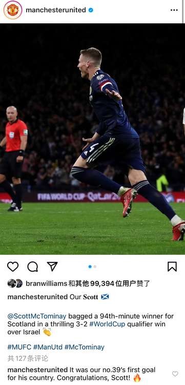 北京时间凌晨0:00,世界杯欧洲区预选赛,苏格兰主场3-2逆转战胜以色列,麦克托米奈在第94分钟帮助苏格兰打进绝杀球,曼联官方社媒送上祝贺:“这是我们的39号为他的国家打进的第一粒进球,祝贺你!我们的斯科特!”