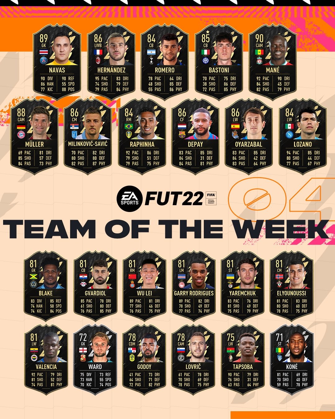 TOTW的主力11人方面,凭借在国家队中的表现,纳瓦斯、特奥、罗梅罗、巴斯托尼、马内、穆勒、米林科维奇-萨维奇、拉菲尼亚、德佩、奥亚萨瓦尔和洛萨诺悉数入选。