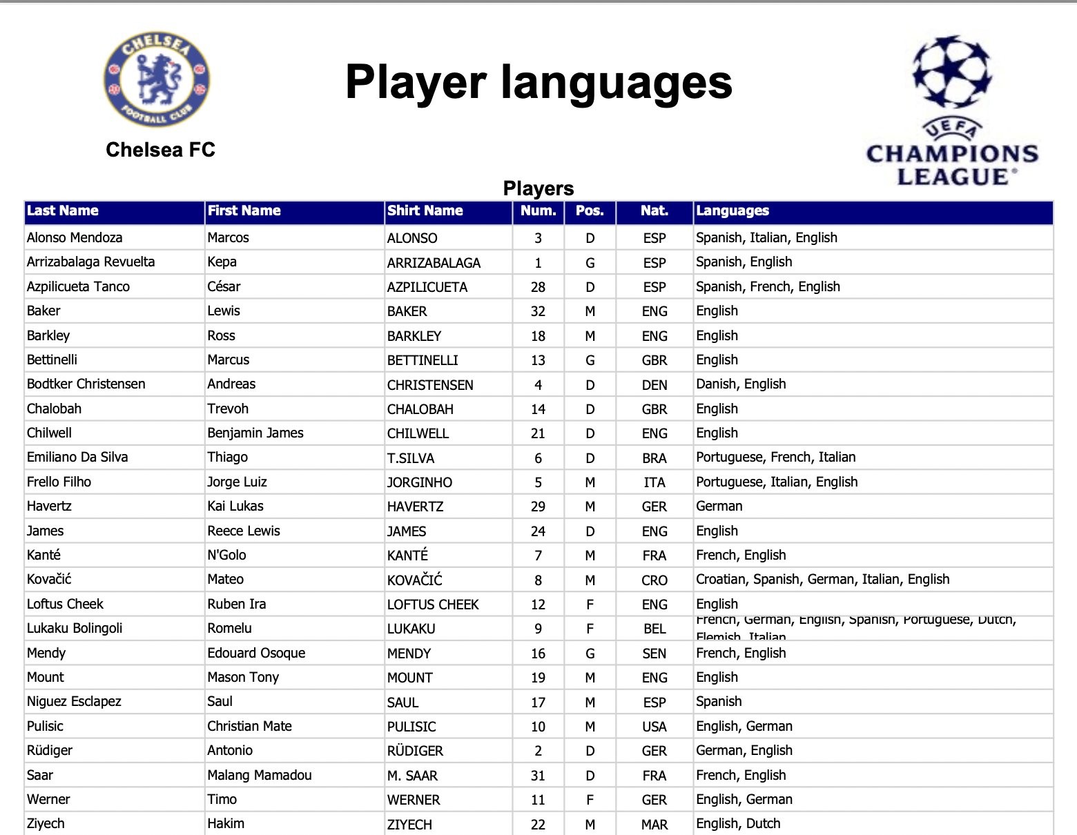 记者Nick Stoll截取了切尔西队的的表格,卢卡库是其中掌握语言最多的球员,他可以说法语、德语、英语、西班牙语、葡萄牙语、荷兰语、弗拉芒语和意大利语。