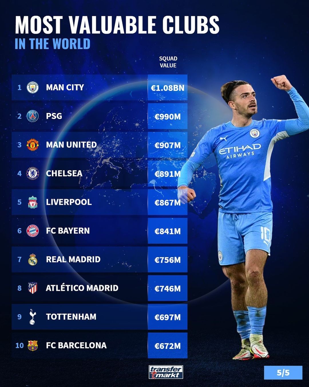 1、曼城,10.8亿欧