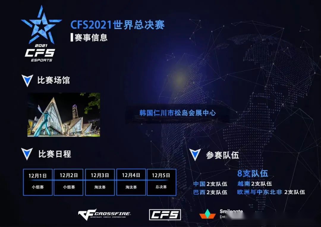 正如上文所说,CFS是CF国际化皇冠上的明珠。今年的CFS2021世界总决赛将由八支队伍组成,包括来自中国区的AG和白鲨;来自欧洲与中东北非区的德国战队Lazarus和埃及TeamMyth;来自美洲区的两支巴西战队Black Dragons和Imperial;来自东南亚的两支越南队伍One T和Celebe 2L。日程方面,比赛将于12月1日开打,12月5日决出最后的冠军。