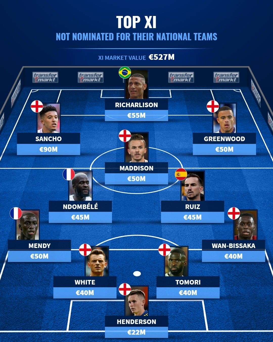 11月的国际比赛日即将来临,德国转会市场网站评选了未入选本期各自国家队的最贵阵容,其中桑乔领衔,英格兰球员占据七席。
