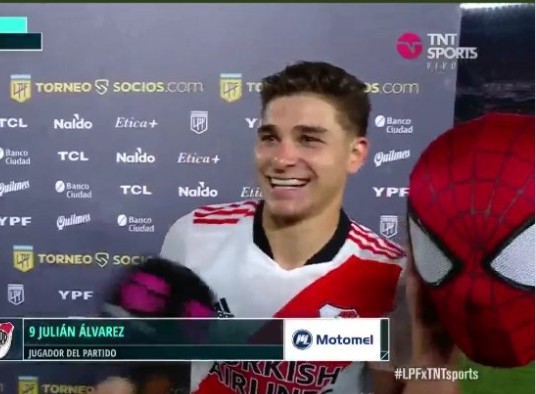 河床主场4-0大胜竞赛,提前3轮夺得本赛季阿根廷超级联赛冠军。赛后,河床头号射手胡利安-阿尔瓦雷斯在接受采访时表示,在阿根廷国家队和那些高水平队友一起训练比赛,这给他带来很大的提升。