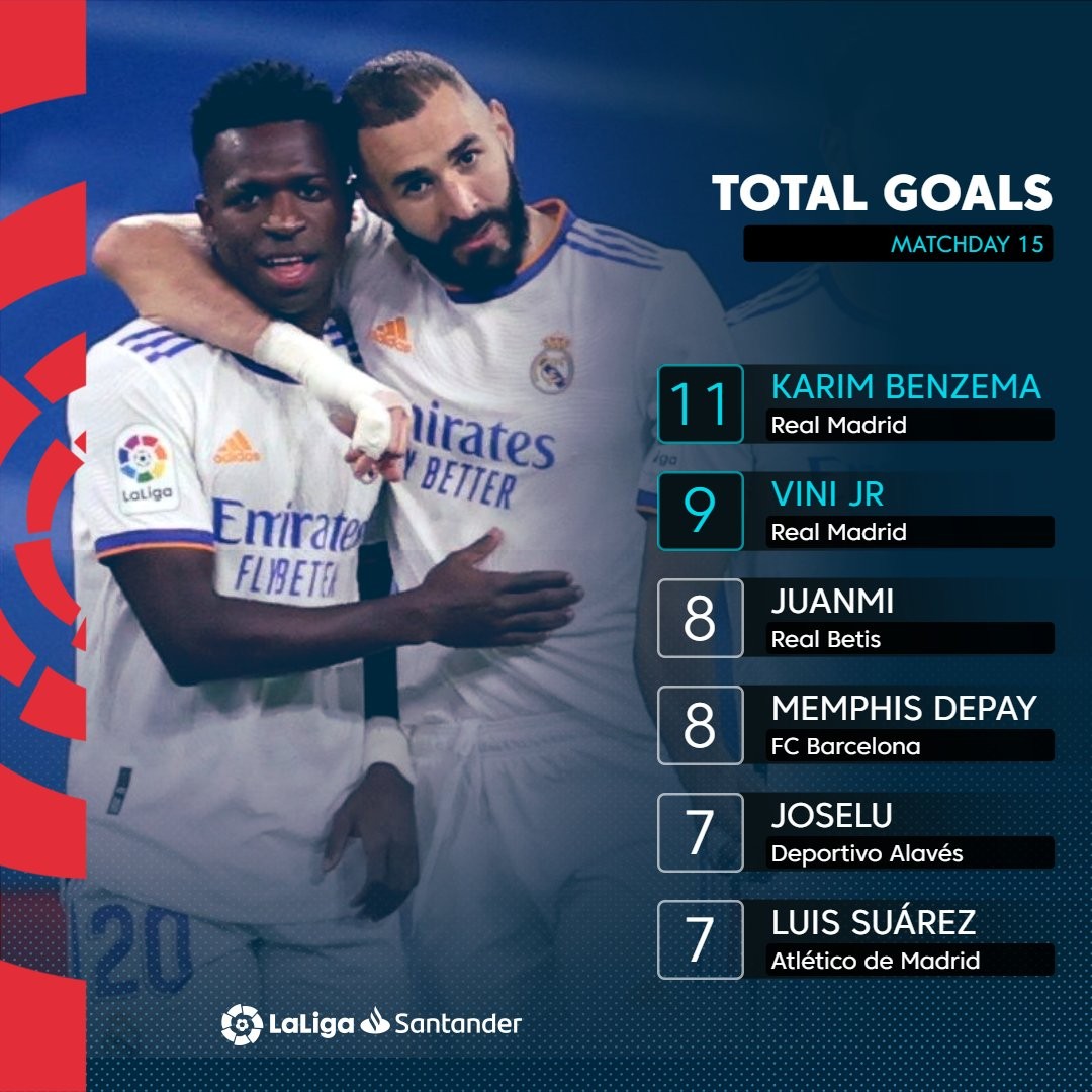 西甲第15轮,皇马主场2-1击败塞维利亚,本泽马和维尼修斯各入一球,本泽马以11球继续独自领跑西甲射手榜,维尼修斯则以9球独占次席。