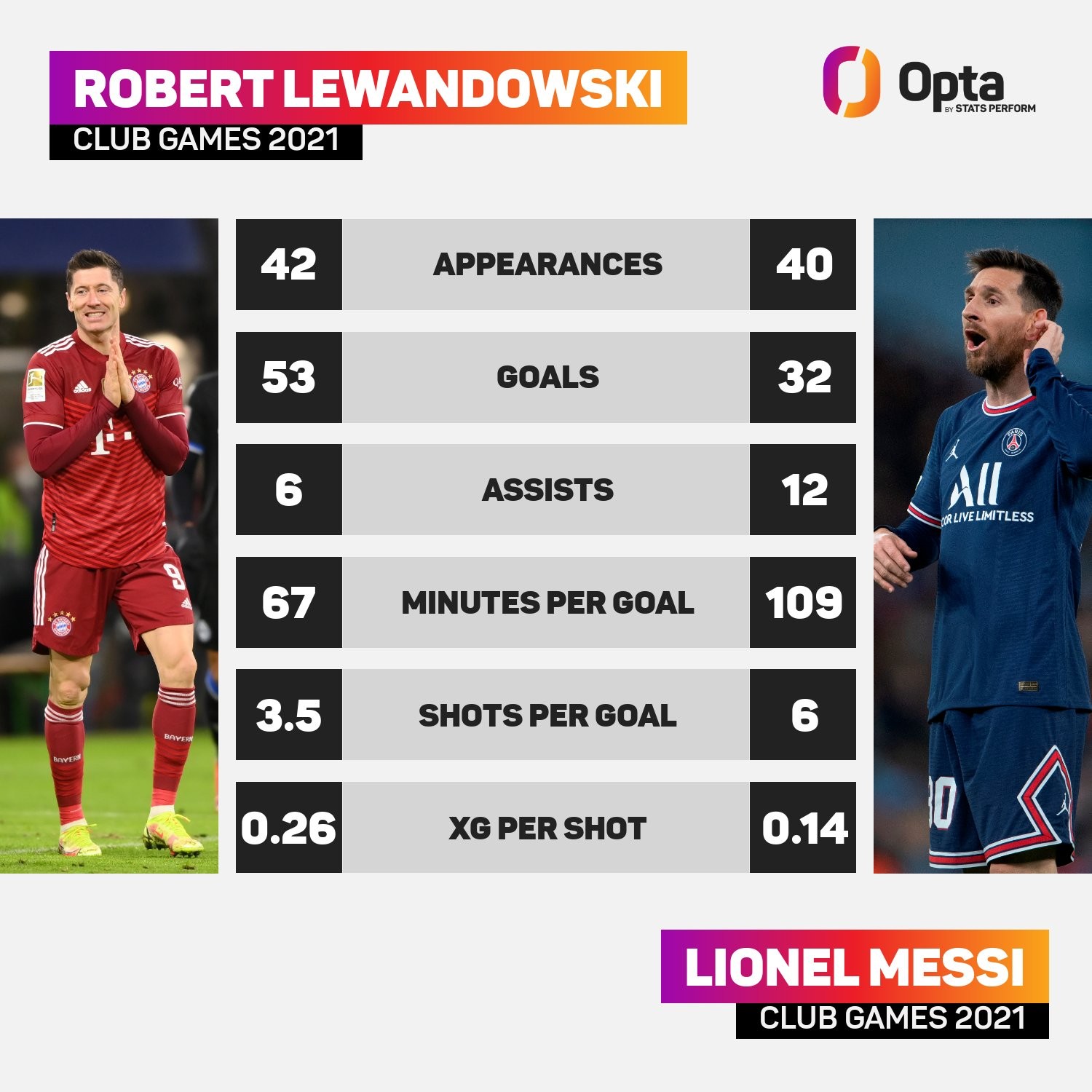 2021年金球奖颁奖典礼即将进行,Opta统计了两位金球奖最有力竞争者莱万和梅西的2021年俱乐部数据,莱万打入53球,比梅西多21球。