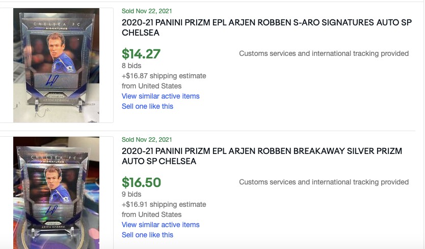 这些是最近成交的价格。并不是大家所认为的,球星卡签字需要花成千上万的价格。像几十,一两百的签字卡也有很多,像罗本这样的球星,签字也刚刚过百而已。