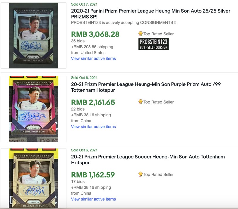分别是孙兴慜的普通版签字,限量99张紫色平行版签字以及限量25张银色平行版签字的成交价格。可以看出,编数越低,价格越高。