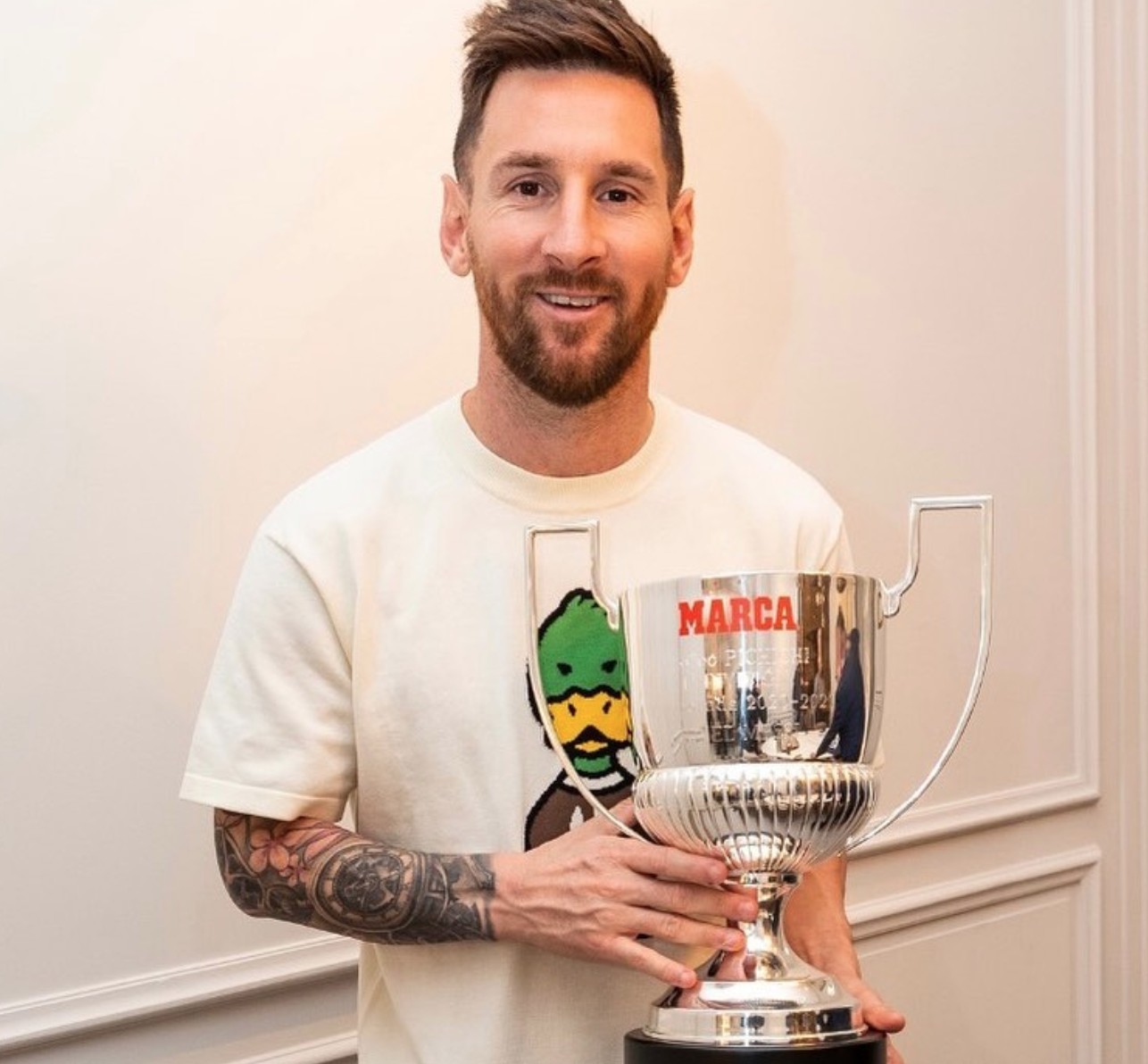 梅西在社交媒体上晒照写道:“很荣幸能成为西甲历史的一部分。拿到皮奇奇对我来说很疯狂,并且能超越萨拉让我感到难以置信,我没想到我能8次拿到西甲金靴奖。感谢所有帮助我的人,以及主办方马卡专门来巴黎给我颁奖。来个拥抱!”