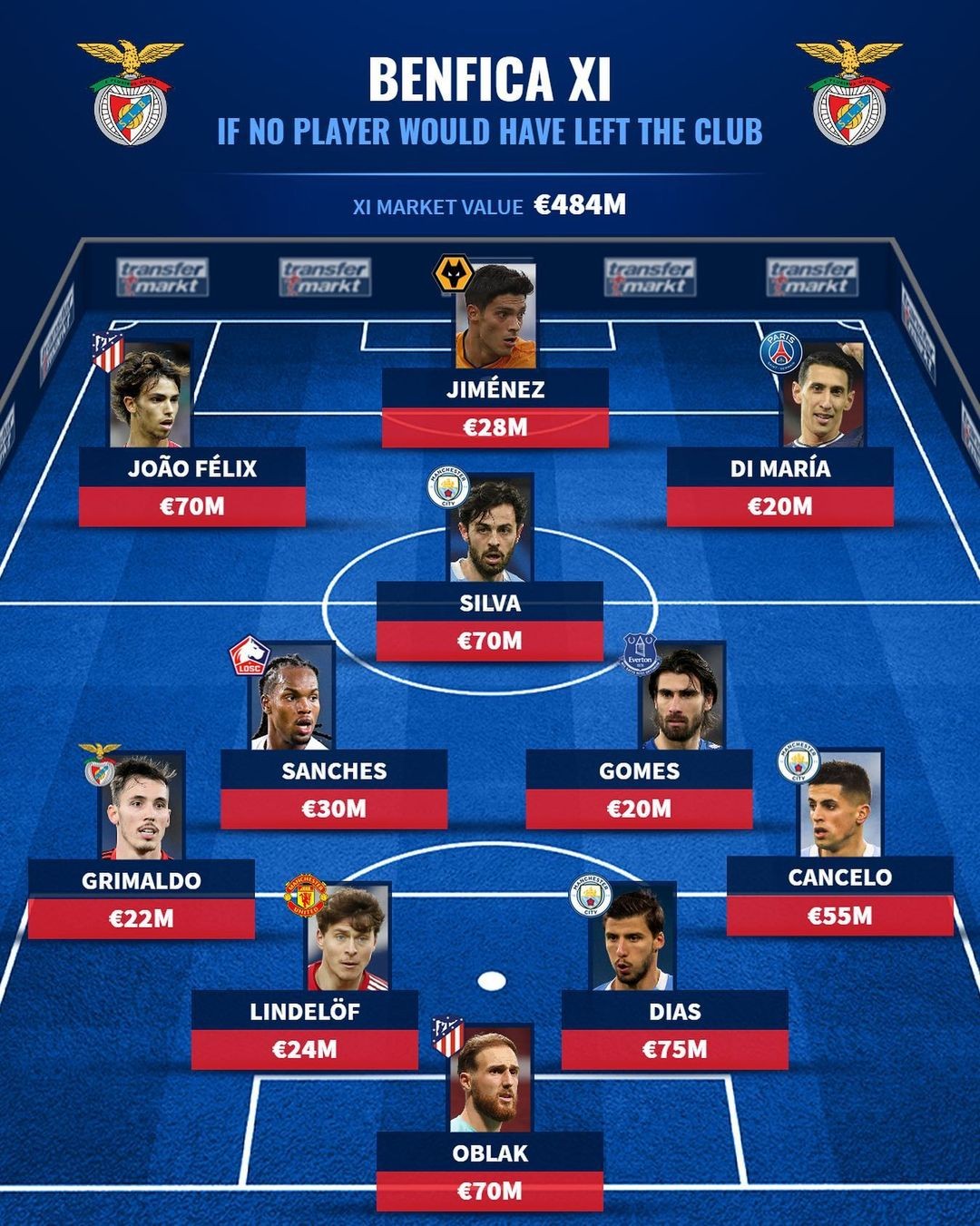 德国转会市场网站评选了由曾在本菲卡效力的现役球员和仍在该队踢球的球员组成的梦幻阵容,其中鲁本-迪亚斯领衔,B席在列。
