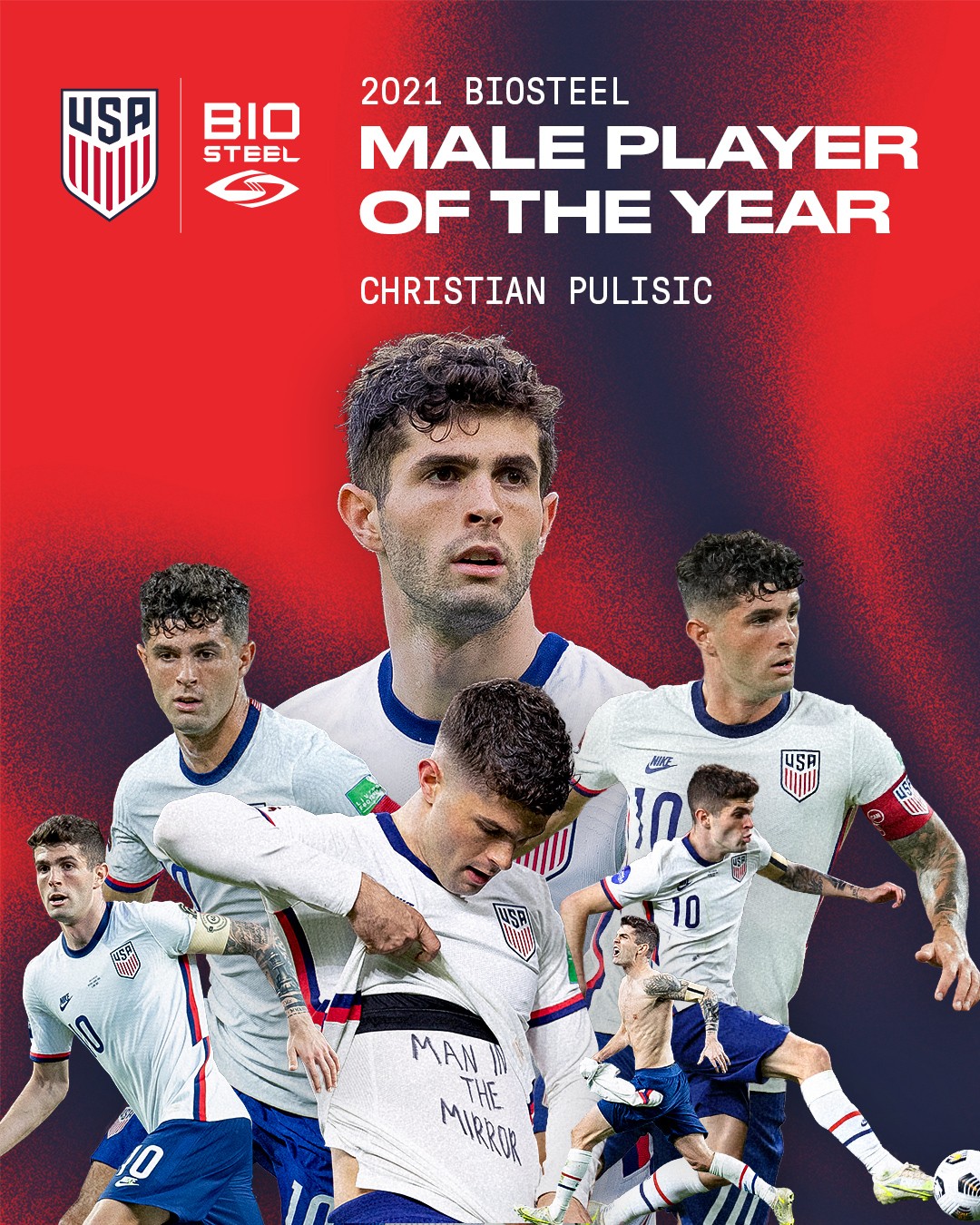 这是普利希奇第三次荣获这一奖项,他曾在2017年和2019年当选美国男足年度最佳球员。