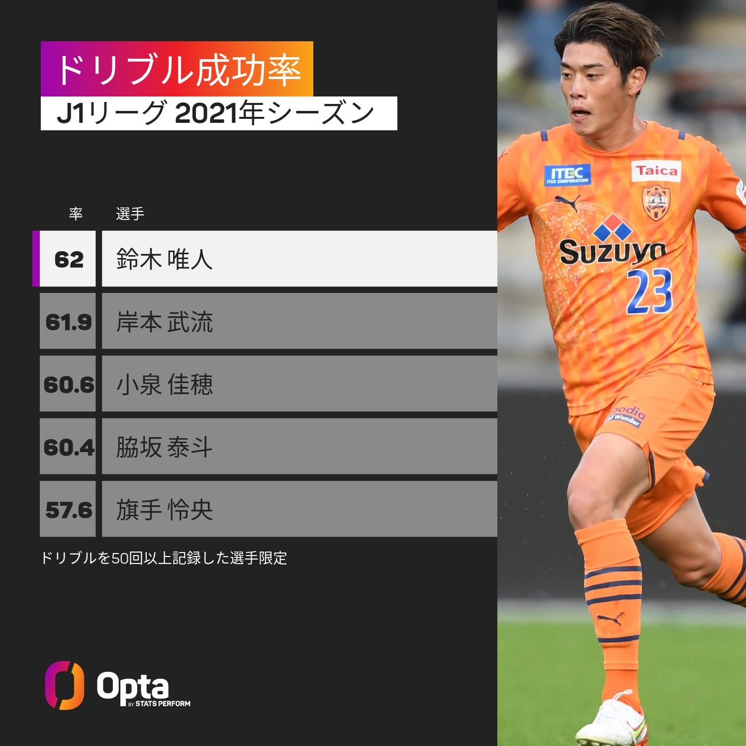 在本赛季J联赛落下帷幕之后,数据机构Opta对J联赛中球员过人成功率进行了统计,清水心跳20岁年轻中场铃木唯人以62%排名榜首。值得一提的是,榜单中的5名球员均为日本本土球员。