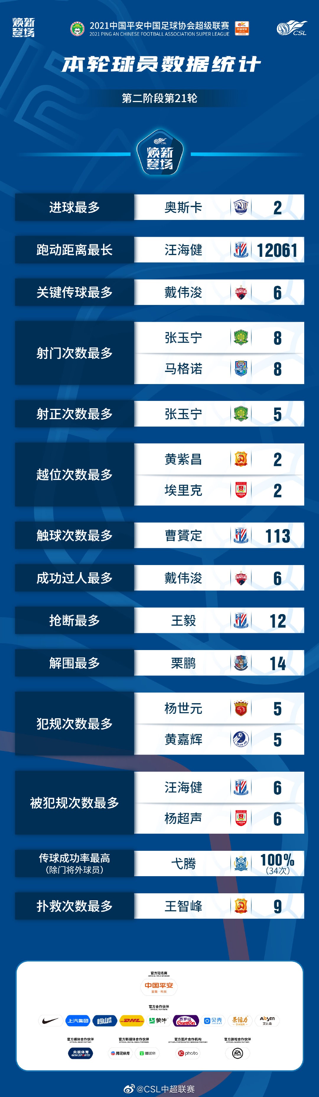 在中超第21轮比赛结束后,中超联赛官方统计了本轮比赛中球员各项数据统计。其中,武汉门将王智峰做出9次扑救,是扑救最多的门将,而深圳中场戴伟浚送出了6次关键传球。