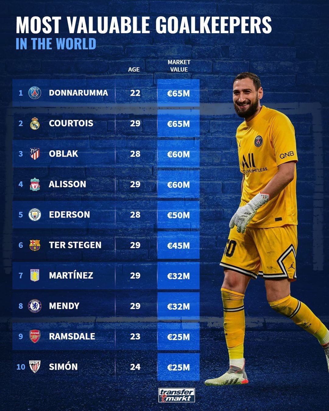 德国转会市场网站公布了最新的门将身价排行榜,效力于巴黎圣日耳曼的多纳鲁马和皇家马德里的库尔图瓦并列榜首,马德里竞技的奥布拉克和利物浦的阿利松同样并列排在前两者身后。