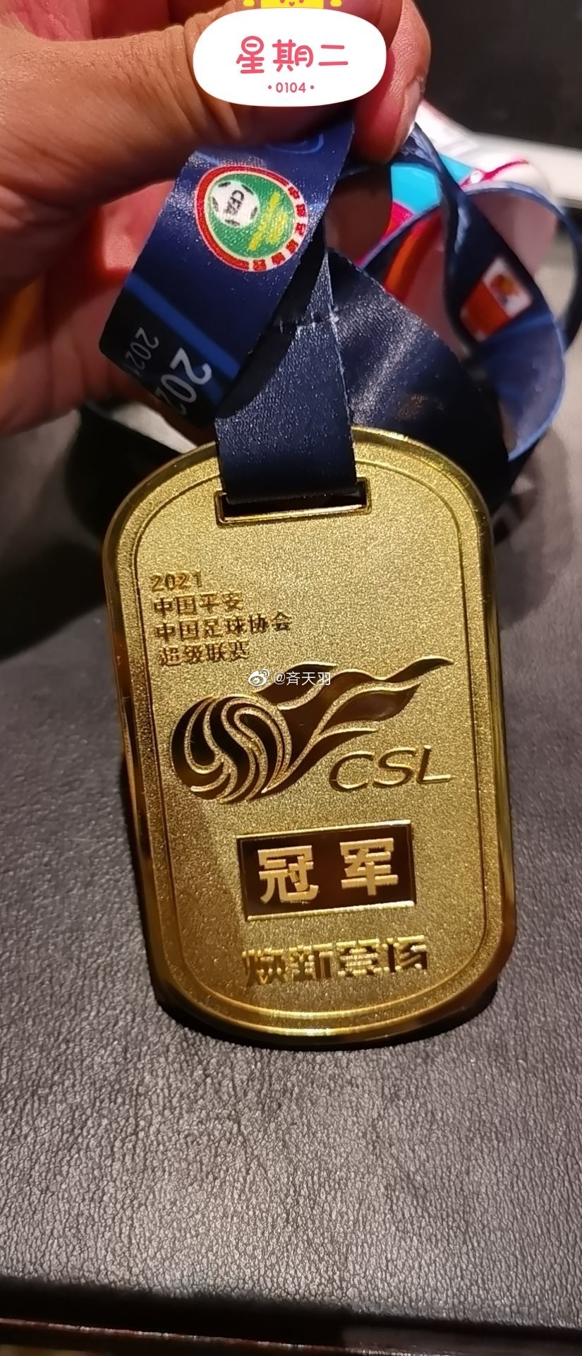 山东泰山时隔十一年再次夺取中超联赛的冠军,最后一轮结束正式捧杯后,齐天羽在微博上分享了冠军奖牌。