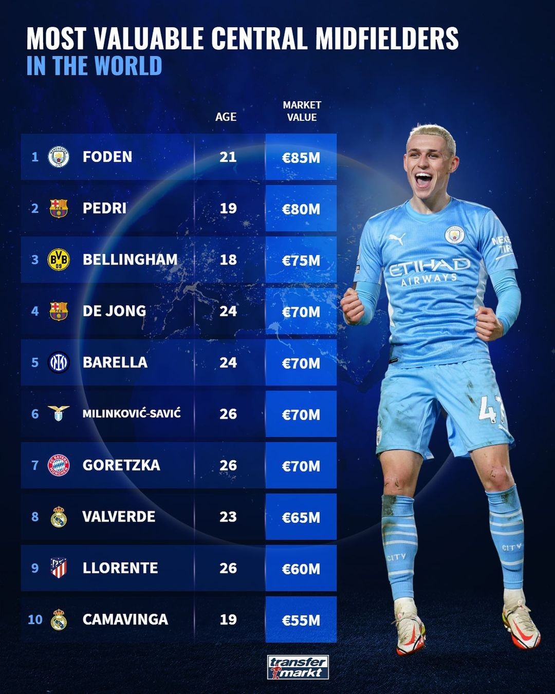 德国转会市场网站公布了最新的中前卫身价排行榜,效力于曼城的福登名列榜首,巴塞罗那的佩德里和多特蒙德的贝林厄姆分列第二、三位。