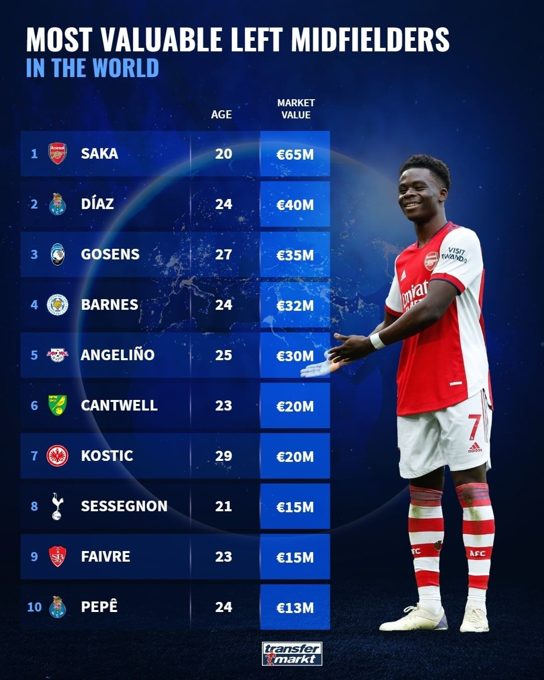 德国转会市场网站盘点了目前世界足坛左中场的身价排行榜,阿森纳攻击手萨卡以6500万欧居首,波尔图中场路易斯-迪亚斯排名第二。