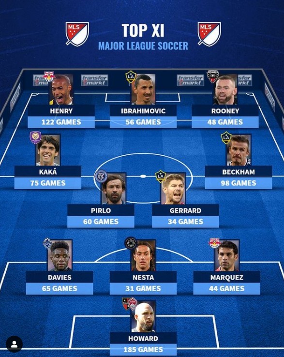 美国职业足球大联盟(MLS)曾签下很多知名球员,德国知名足球数据网站“转会市场”评选出了美国职业足球大联盟历史上的最佳阵容。这套阵容星光熠熠,贝克汉姆、伊布、皮尔洛、亨利等多名知名球星入选。