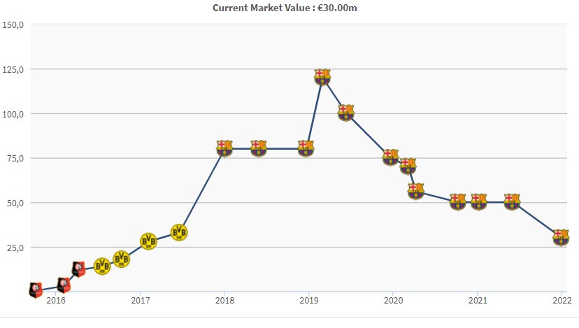 登贝莱出道于法甲球队雷恩,他在雷恩的身价一直在上涨,从最初的25万欧上涨到1200万。2016年夏天加盟多特蒙德时,当时登贝莱的身价是1200万欧,2017年离开多特蒙德时,他的身价是3300万欧。在巴塞罗那,登贝莱的身价经历了过山车般的变化,2018年1月,他的身价是8000万欧,2019年2月,登贝莱的身价达到顶峰,达到了1.2亿欧,随后登贝莱的身价一路下跌,目前只有3000万欧。