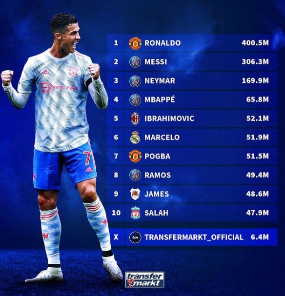 曼联球星C罗在社交媒体的粉丝数超过了4亿人,是足坛第一位社交媒体球迷达到4亿的球员。德国知名足球数据网站“转会市场”列出了足坛球星社交媒体的粉丝数排名,C罗排名第一,梅西排名第二。