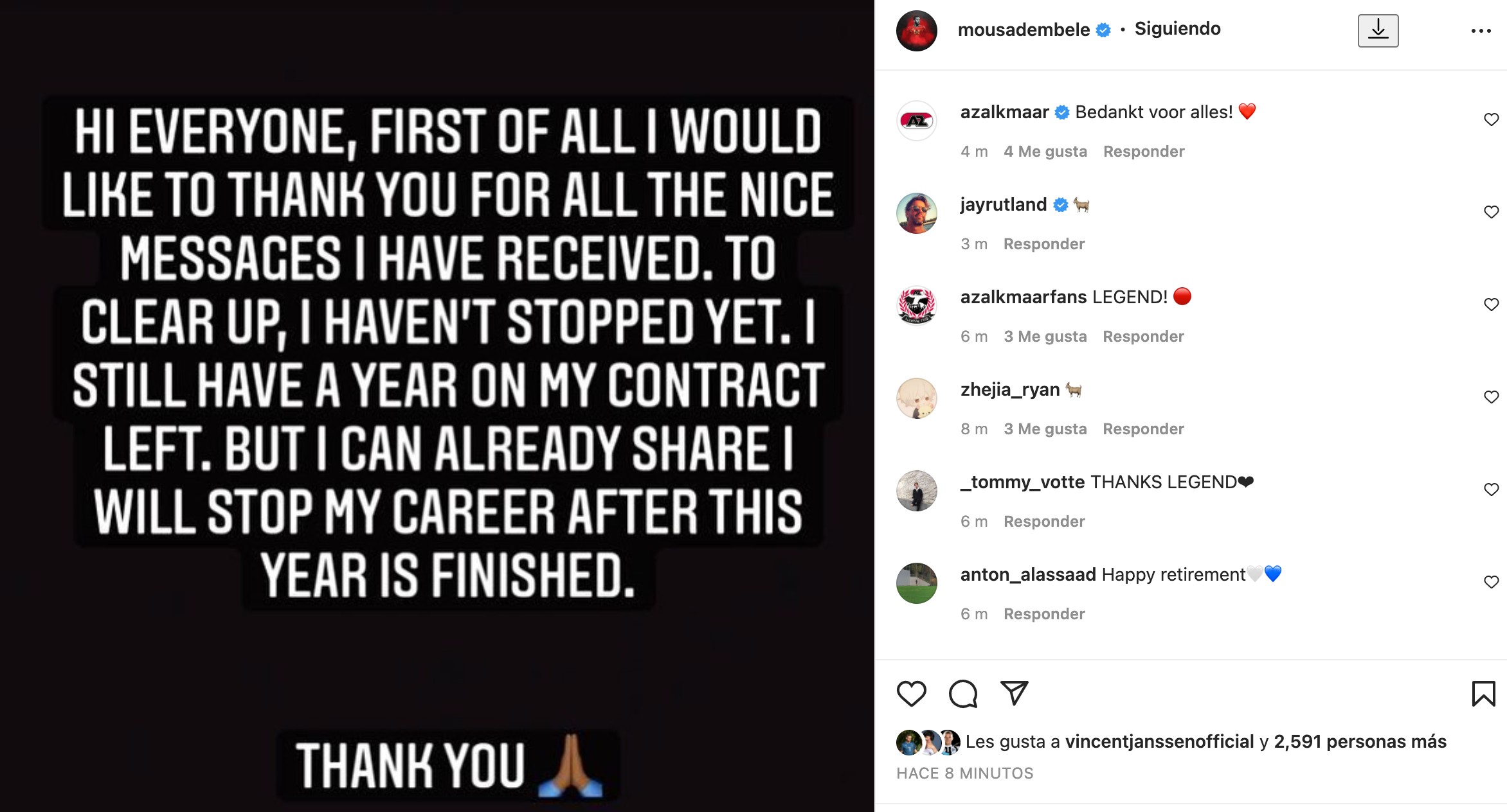 登贝莱在社交媒体上写道:“大家好!首先,我收到了很多来自大家的祝福,我对此表示感谢。但我要澄清一下:我还没退役呢!我目前还有一年合同在身,但我可以向大家分享的是,我会在今年结束之后终止自己的职业生涯。”