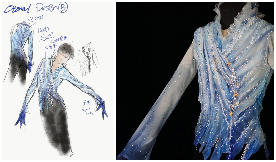 除了尺码定制外,风格亦是如此,伊藤聪美还透露:“羽生结弦像是设计师,而自己是他的助手”。在定制一套考斯滕前,羽生结弦都会直接把要穿着表演的音乐发给她,根据风格再设计出好几个方案。比如这套蓝色的就是Plan B↓