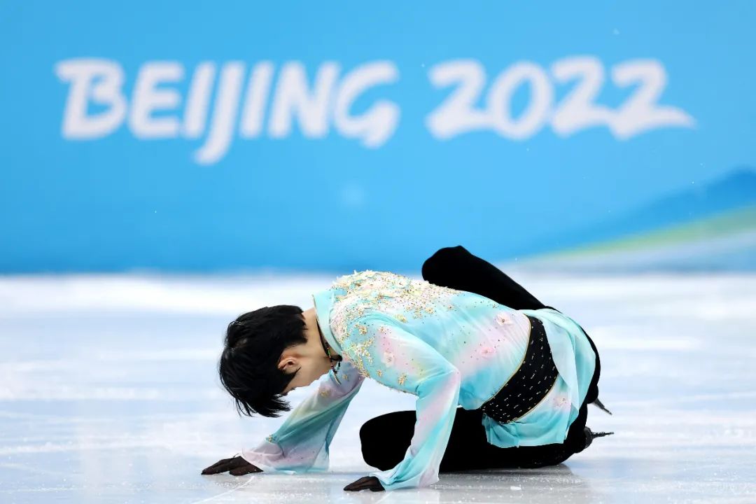 比赛结束后,羽生结弦向观众深深鞠躬,俯身触摸冰面,令人感动。作为一名已经27岁的老将,这可能是他最后一届奥运会了。