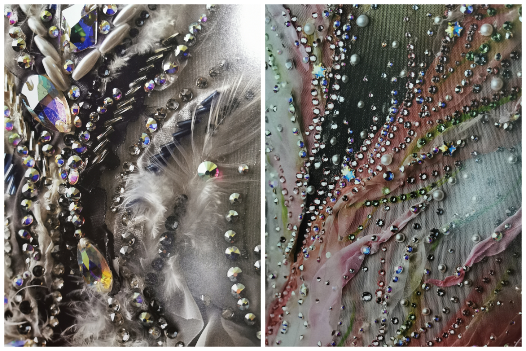 来近赏一张细节图,薄如蝉翼的面料上装饰了无数颗彩钻,十分震撼。