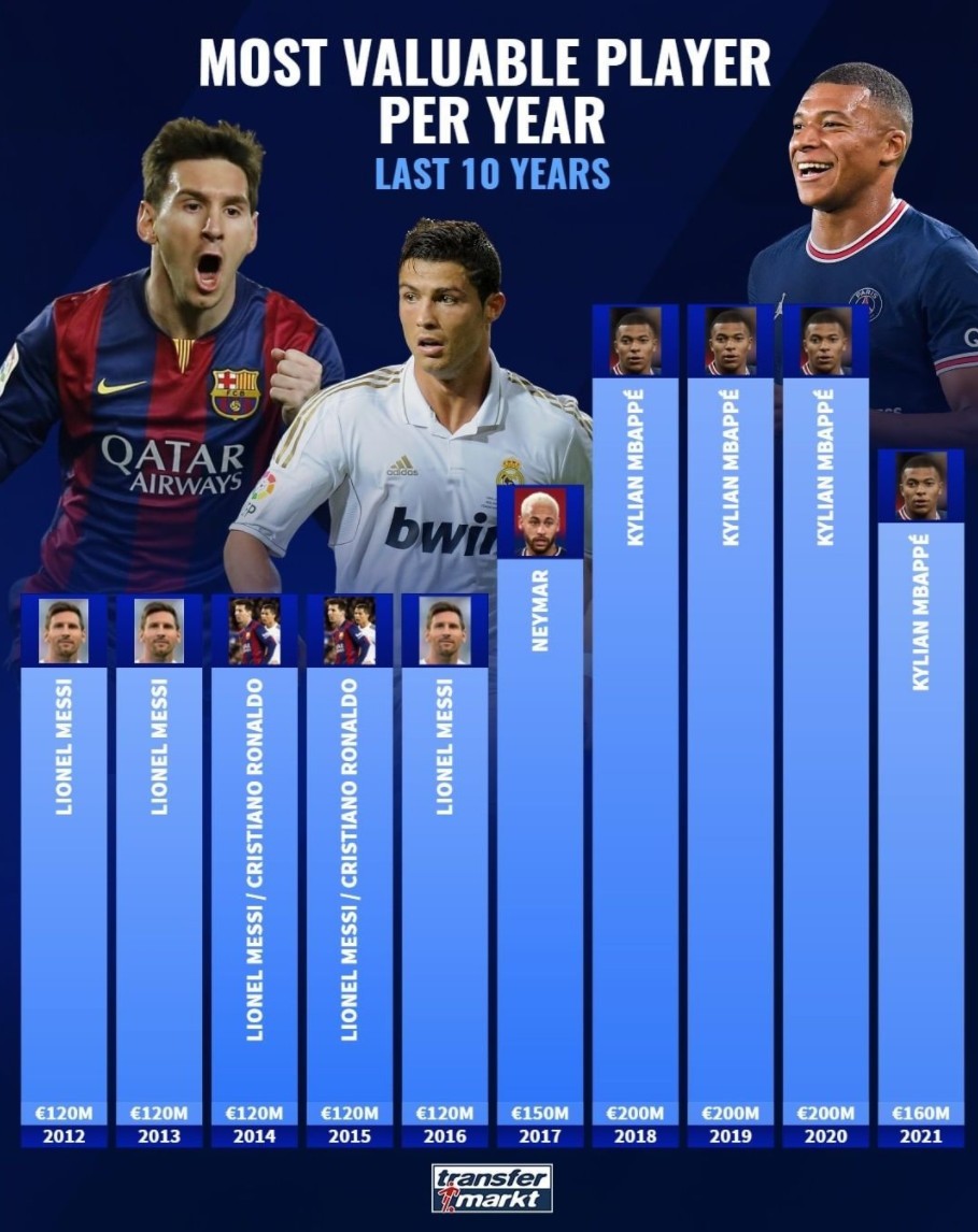 德国媒体“转会市场”统计了过去10年中每一年身价最高的球员:梅西5次上榜,姆巴佩4次上榜。