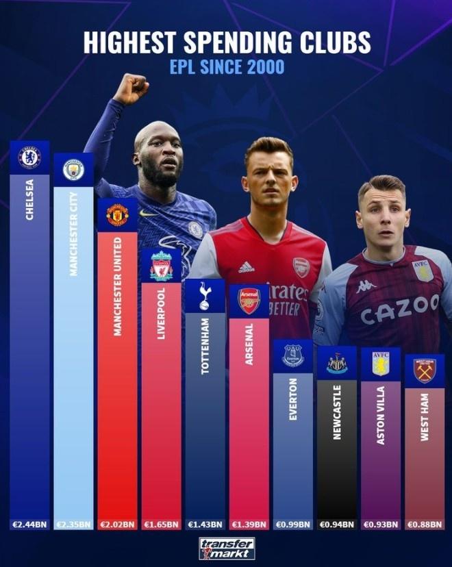 德国转会市场网日前统计了21世纪以来英超俱乐部引援投入排行,切尔西24.4亿欧元排名第一。