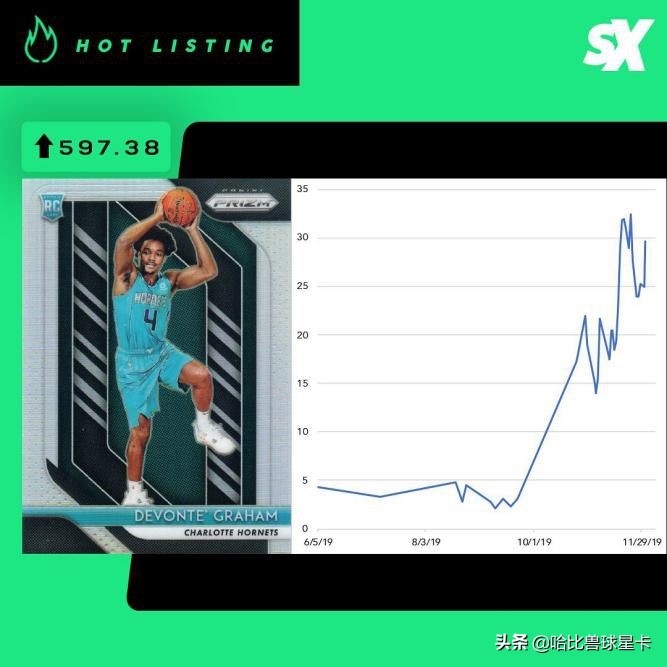 球星卡的不确定性也体现在其价值的波动性上。一张球星卡的市场价值并不是一成不变的,会随着球员赛场表现等等因素而产生波动。例如今年爆发的黄蜂队球员德文特·格拉汉姆,他的新秀年Prizm普折从今年6月到11月,在二级市场上的成交价上涨了597.38%。
