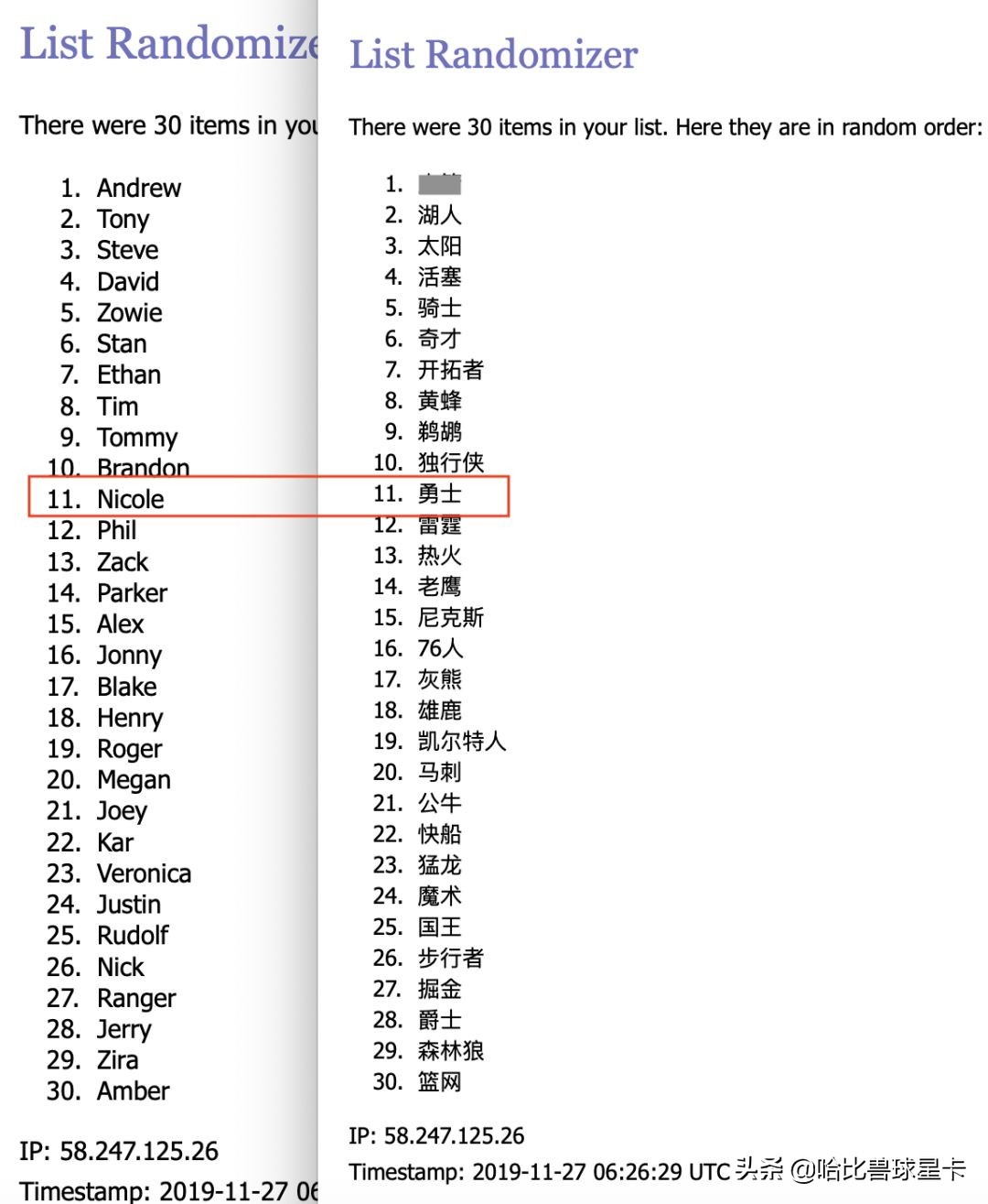 买队。以NBA为例,集合所有的买家,随机分配球队。拆完卡之后,不论拆出什么卡,都归属相应的买家。下图是笔者前不久和朋友开箱19-20 Panini NBA Hoops的随机分队情况。可以看到,第11位的Nicole随机分配到勇士,那么无论之后开到库里的签名卡还是帕斯卡尔的普卡,都属于Nicole所有。