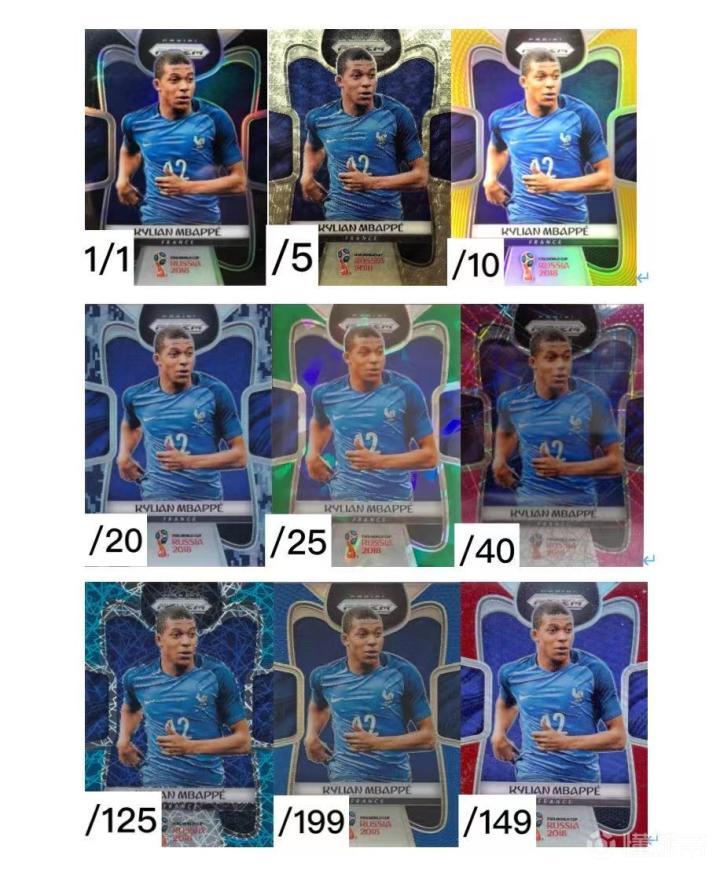 大家可以注意到,这所有的九张卡与姆巴佩Base卡的设计、选图其实是完全相同的,只是在颜色和折射效果方面发生了变化,所以我们也称同一版卡的不同折射版本叫作这张卡的平行卡。另外我在图中标注了每版折射的限量数,第一张代表限量1张,第二张代表限量5张,以此类推。这九张并不是姆巴佩Base的所有平行,还会有许多限量或不限量的版本。如果我们集齐了所有版本,那么这一套姆巴佩Base的所有平行就叫做“彩虹套”。