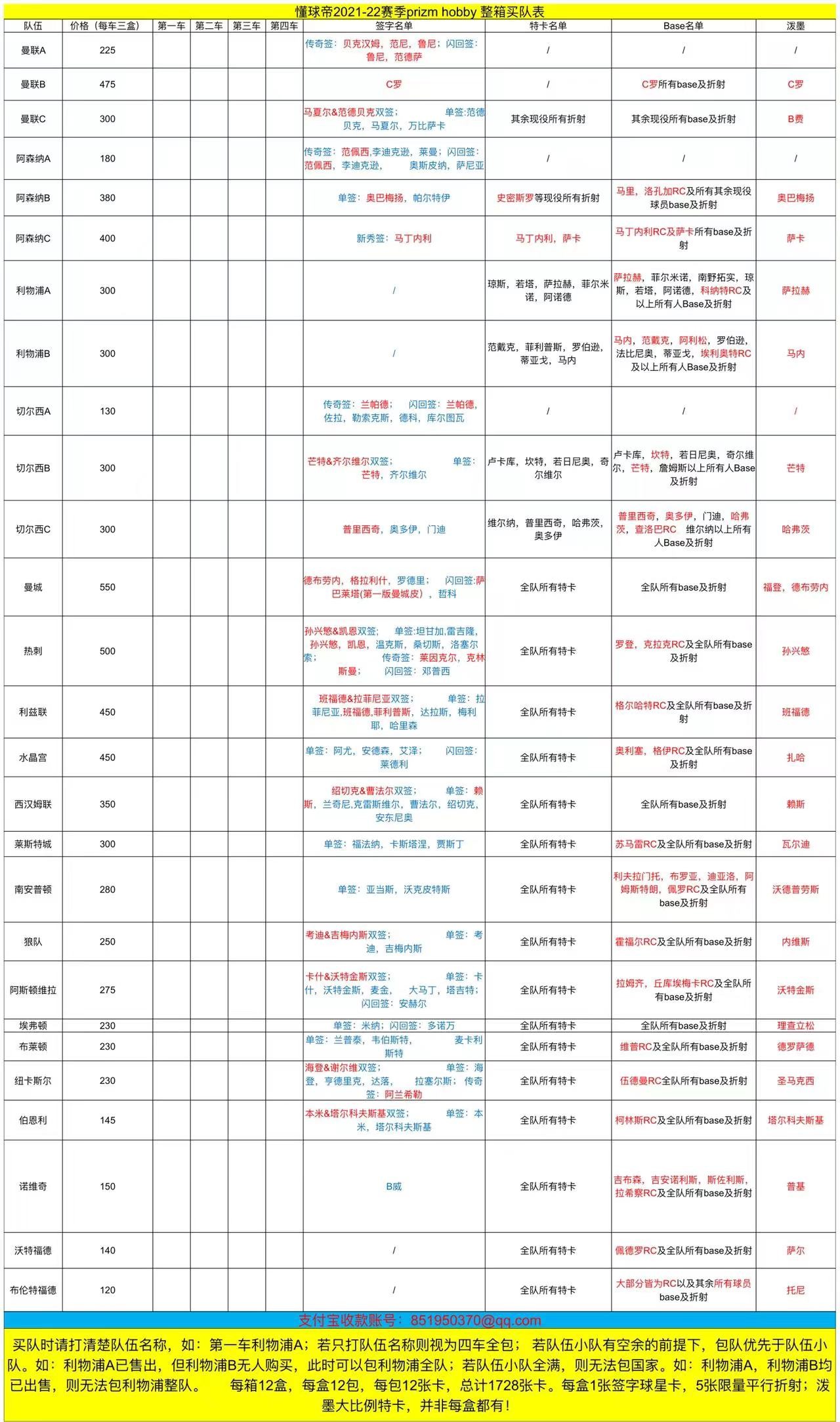 左边价格为三盒的价格,乘以4就是整箱的价格啦,右边是每个队可能会出的配置卡:签字名单,特卡名单,新秀和现役名单以及大比例特卡泼墨的名单,因为卡价不同,所以每个队伍的价格也有所不同。