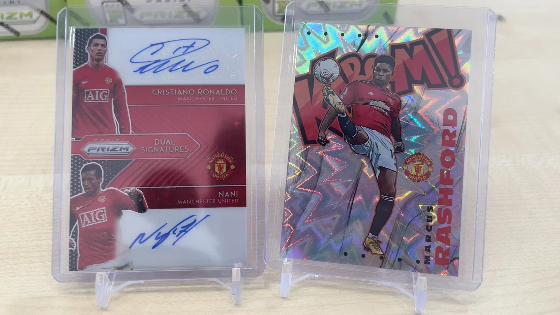 亚洲版英超prizm我们拆出了系列最大签字球星卡,纳尼和C罗世界限量8张的双人签字!还有插放在亚洲pz很少见的kaboom!一盒出的这两张算是亚洲版PZ的顶峰了!
