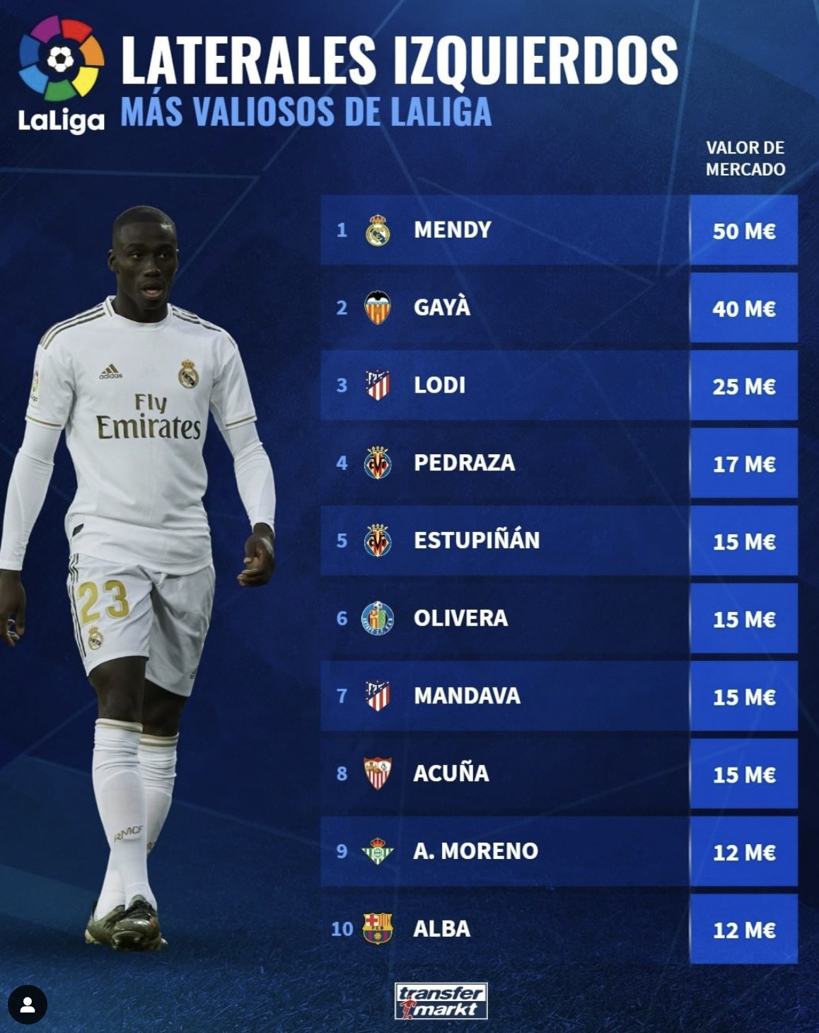 德国转会市场统计了西甲左后卫球员的最新身价,皇马后卫弗兰德-门迪排名第一,巴萨后卫阿尔巴位列第十。