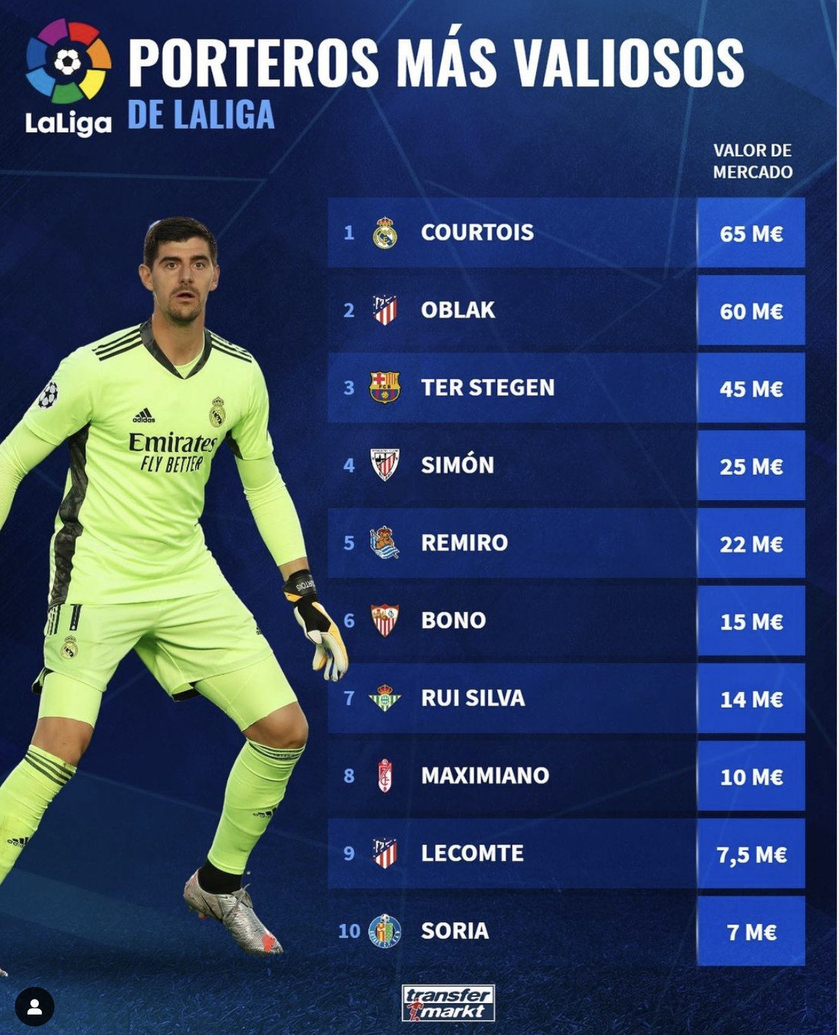 德国转会市场统计了西甲门将球员的最新身价,皇马门将库尔图瓦排名榜首,马竞门将奥布拉克位列第二,巴萨门将特尔施特根第三。