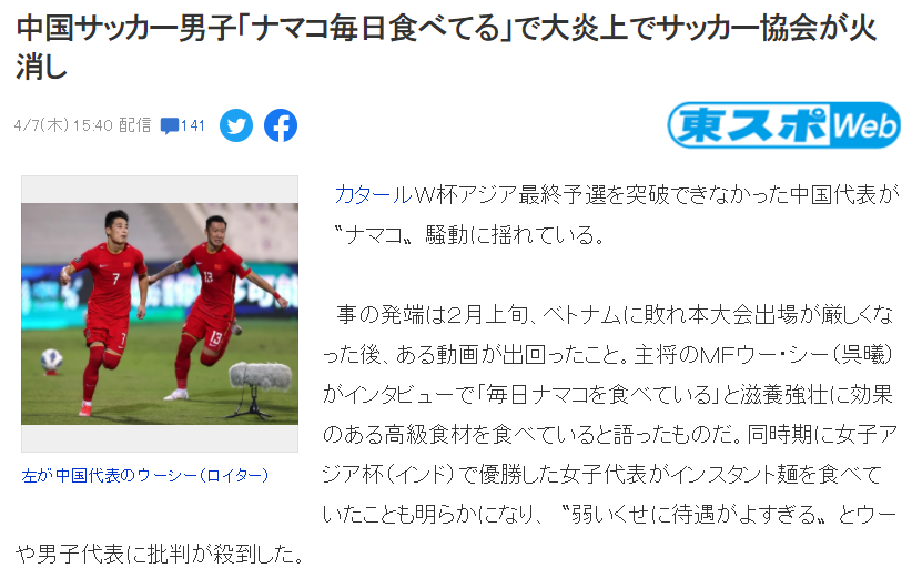 日媒援引“新浪体育”的消息,对中国男足在输给越南后,2月初时队长吴曦在一段视频中表示“自己每天都吃海参”给予了报道。尽管到目前为止“海参事件”已经过去了2个月,但中国男足仍然处于漩涡中。