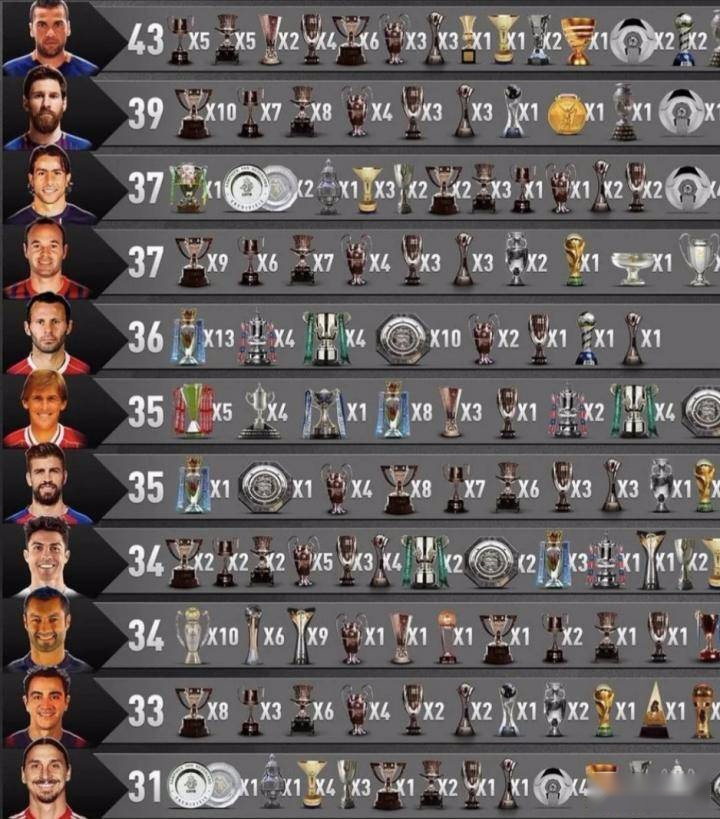 同时,阿尔维斯也分享了所有球员的夺冠次数排行榜单,他是唯一一位夺得冠军数超过40次的球员,达到43次。