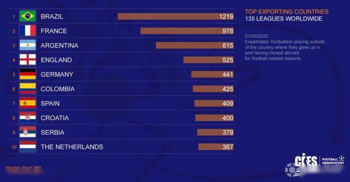 瑞士著名的体育研究机构CIES足球天文台统计了80个国家和地区的足球协会在全世界135个联赛中效力的海外球员数量,其中巴西以1219名海外球员高居榜首,法国978人排名第二,阿根廷815人排名第三。