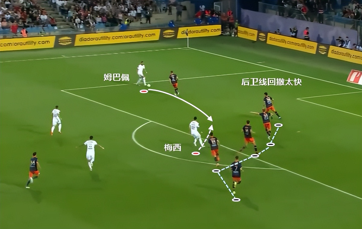 蒙彼利埃这条防线是由白人球员组成,梅西多少有些梦回西甲的错觉。迪马利亚转移球找姆巴佩,后者再横传梅西时,蒙彼利埃的后卫退防太靠后了。