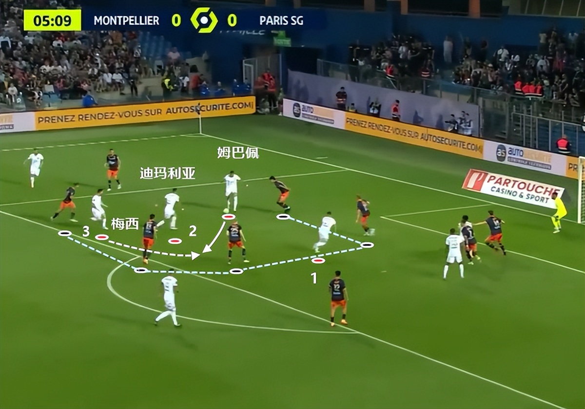 姆巴佩送出横传时,蒙彼利埃的防线站位恰好留出一道走廊,给到3名巴黎球员足够的处理球空间。