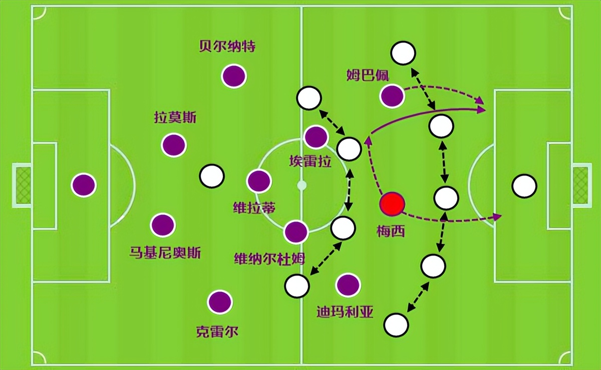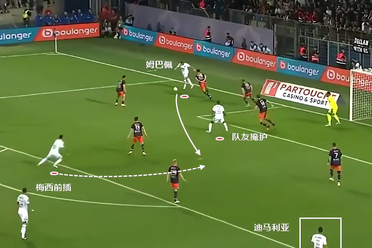 包括本场比赛的第3个进球,同样也是姆巴佩左路传中,中路梅西在队友前插掩护,留出背后空间时快速包抄接应。
