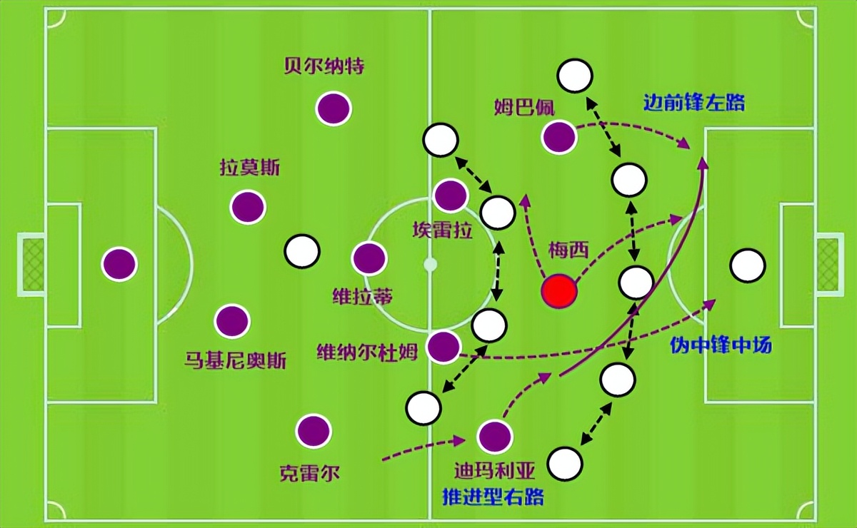 同时在中场位置,最好有一个能够前插禁区的伪中锋,有利于梅西回撤拿球时进行换位。