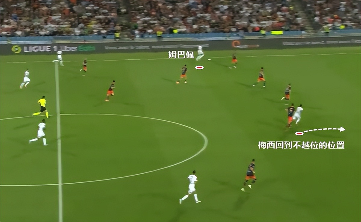 这一波由多纳鲁马手抛球发起的反击中,原本在姆巴佩接球时,梅西处在了越位位置。不过踢伪九,梅西的经验是非常丰富的。