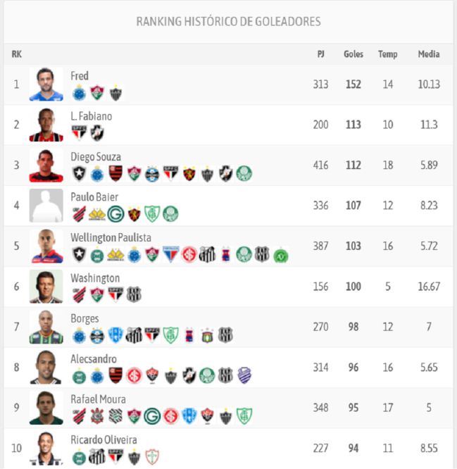 头号球星:弗雷德。37岁的老将,在CCTV百大进球集锦中还能经常看到他在欧冠打入的牛尾巴进球,只可惜他在法甲里昂效力的后期与俱乐部闹翻,旅欧经历比较失败。弗雷德虽然年事已高,但是他在中锋位置的支点作用依然十分明显,是球队进攻的桥头堡。目前,弗雷德是巴甲历史射手榜(下图)头名,遥遥领先于路易斯-法比亚诺。