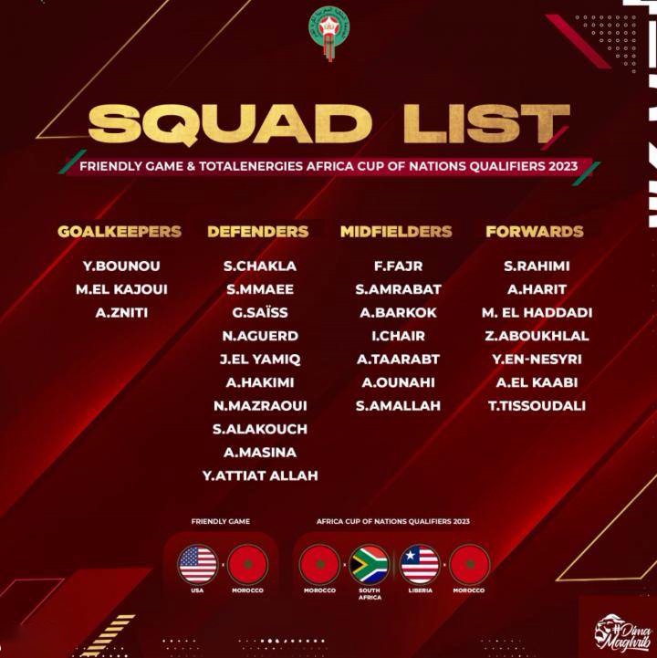 摩洛哥国家队公布了最新一期的大名单:阿什拉夫领衔,马兹拉维回归,齐耶赫继续无缘入选。摩洛哥将与美国队进行一场友谊赛,之后会在下个月的非洲杯预选赛中对阵南非、利比里亚。