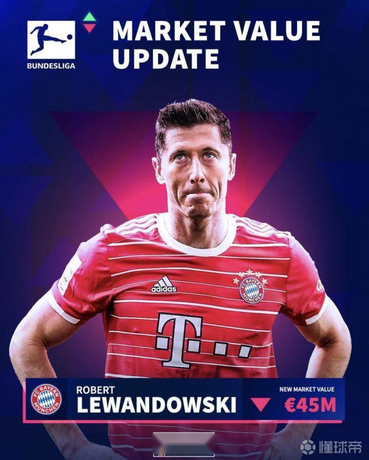 6月9日,德国转会市场更新了莱万多夫斯基的身价,下降到了4500万欧元。
