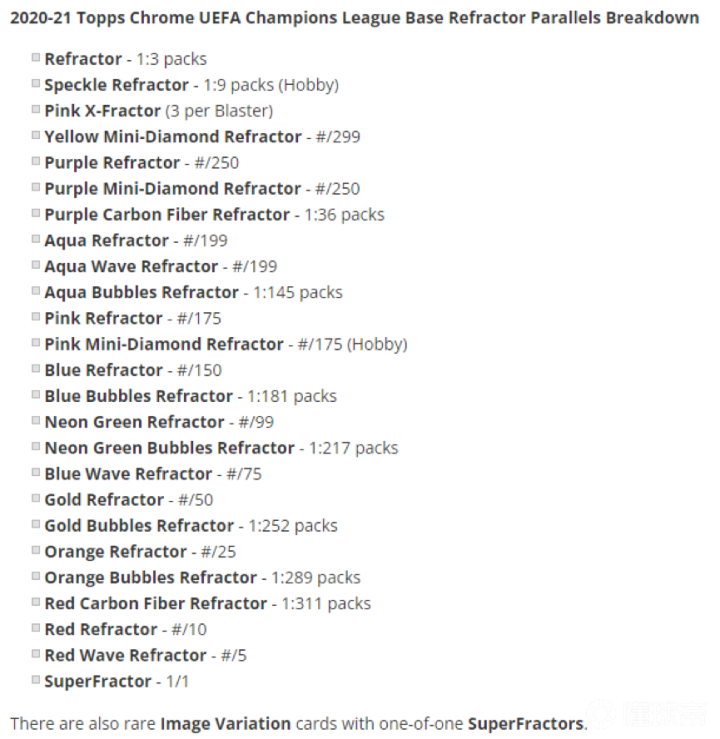 不难看出官方数据排列大概是根据稀有度从上到下,有细心的小数学教们,可以根据大比例折射与限量折射之间的关系计算一下官方的发行量哦。