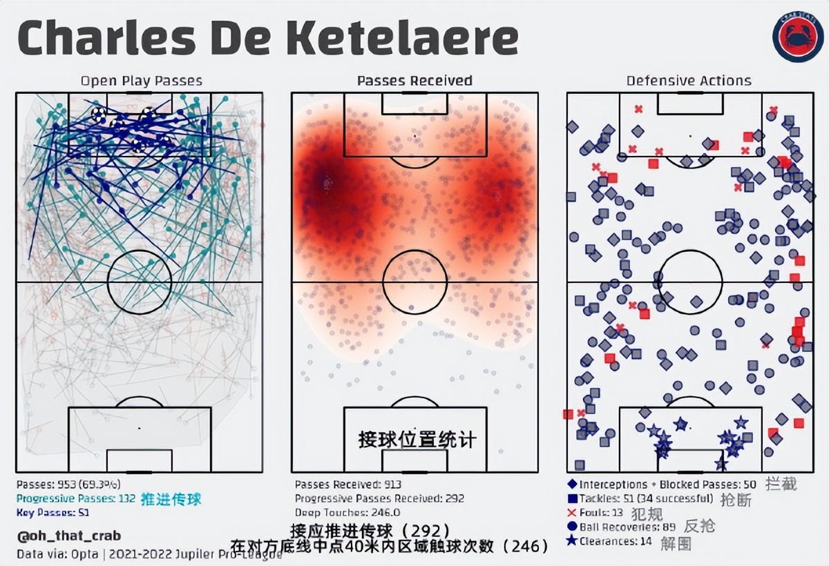 从统计数据可以看到,德卡特莱尔的活动范围很大,他可以频繁去到边路和禁区肋部接球、传球。